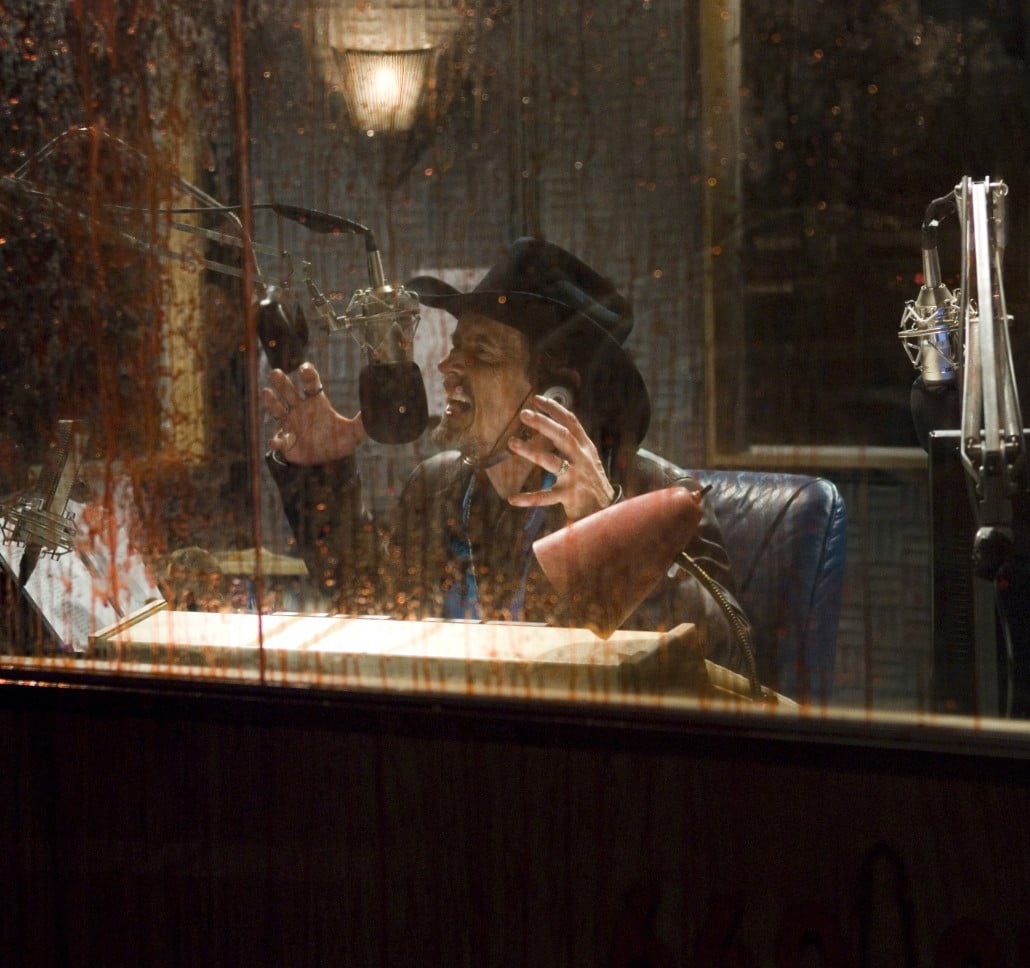 We only get the data our main characters do, desperately listening for clues- and we may end up as infected and nonsensical as the callers are. Pontypool turns out to be a genre hopscotch; while wearing its satire/social commentary front and center, the horror’s interspersed with absurdist comedy (local theater troupes using the radio to promote themselves and exasperate Grant show up in full costume) to surreal vignettes (alternately touching and confusing onscreen images of the dead representing obituaries), to flat out brain-twisting(most of the third act in which a potential cure is tried out).