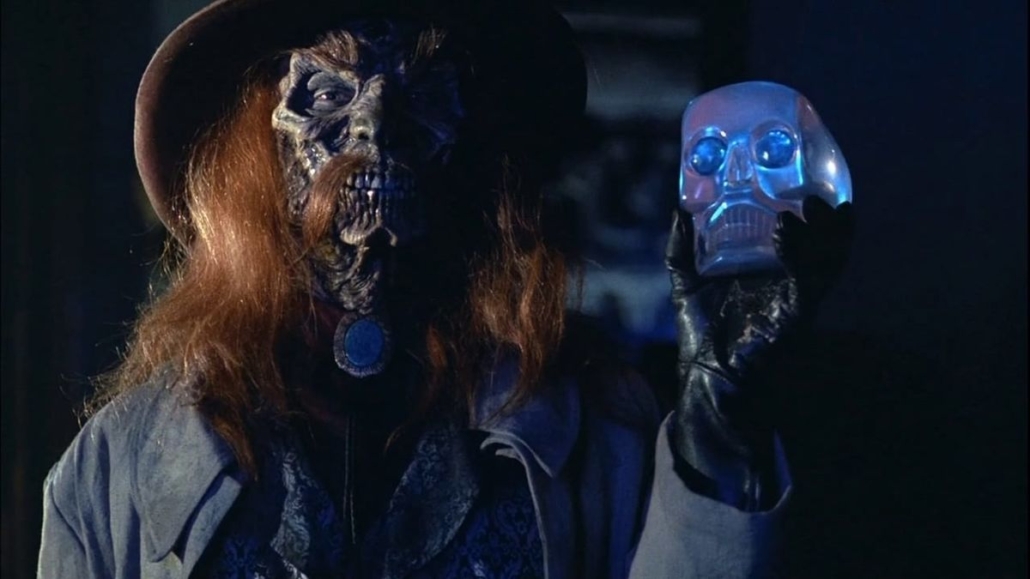 Then it gets ridiculous. Ridiculously traumatic, that is! Woo! Now, yes, the first 5 minutes feature a young kids parents being shot to death. However, by the time the young ones get their eyes on that dogapillar, they’ll have forgotten all about that unpleasantness, besides Harry Potter pretty much starts out that way! Where HOUSE II gets down to business is near the end of the film in what feels like might be the last scene. The main characters, and an assortment of strange, but non-threatening weirdos collected throughout the movie, are having a nice dinner when…hey, what’s that under the big serving dish? A turkey? A roast? Another dogapillar? Oh, no, no, no. How about a nasty 6 foot tall zombie cowboy with a skully face who wants to murder everyone. When I was watching this in the theater I nearly stained my everything. It comes out of nowhere and it comes on fast! The kids will never look at chaffing dishes the same way.