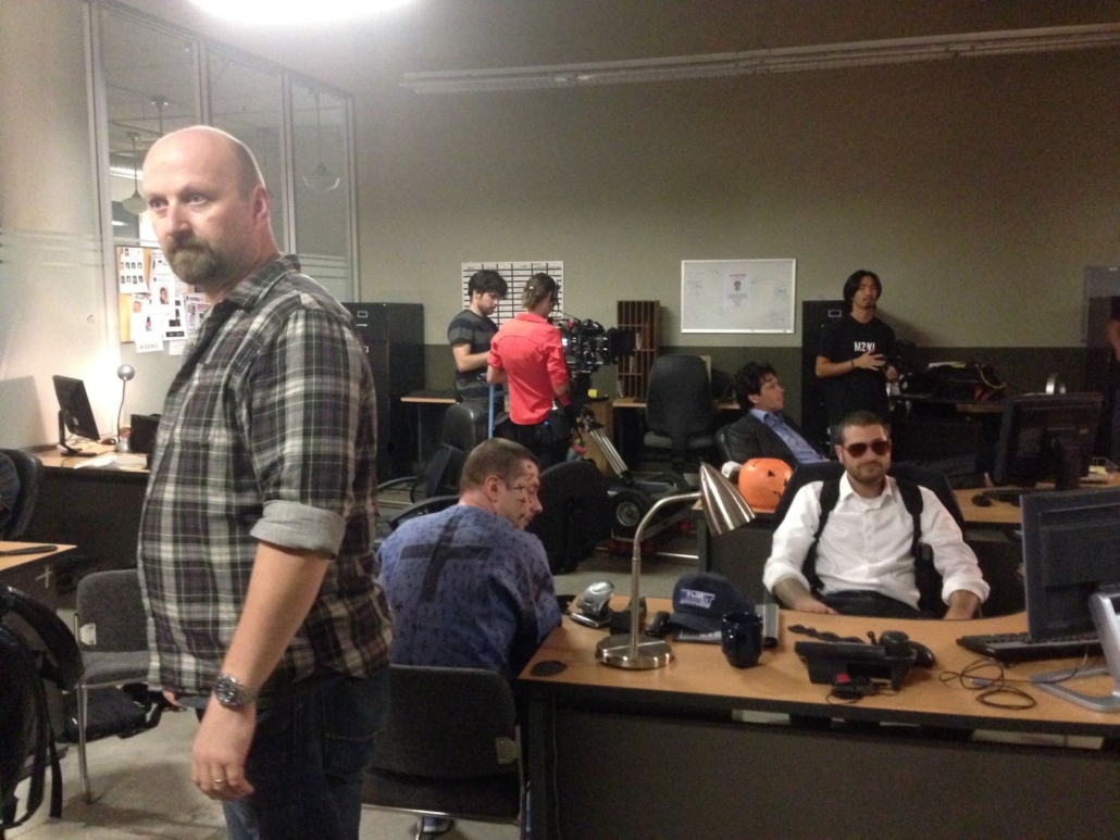 NM: I got my agents in there. Graham and Adam as you mentioned. And all the other directors are in the police station, except for Shifrin who was in the hospital becoming a dad! And Bousman too. Our producers Shaked Berenson and Patrick Ewald are in several scenes and constantly being changed and used as extras in scenes. They are so awesome and so pro-active and trying to help out as much as possible. They’re great.